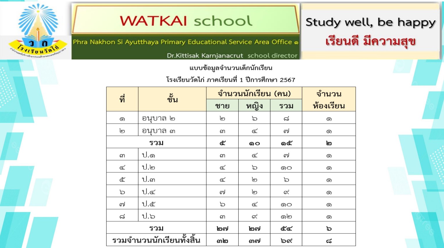 จำนวนข้อมูลเด็กนักเรียน โรงเรียนวัดไก่ ภาคเรียนที่ ๑ ปีการศึกษา ๒๕๖๗