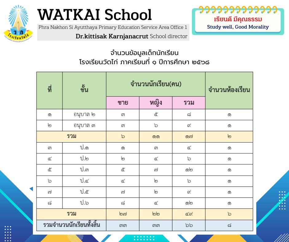 จำนวนข้อมูลเด็กนักเรียน โรงเรียนวัดไก่ ภาคเรียนที่ ๑ ปีการศึกษา ๒๕๖๘